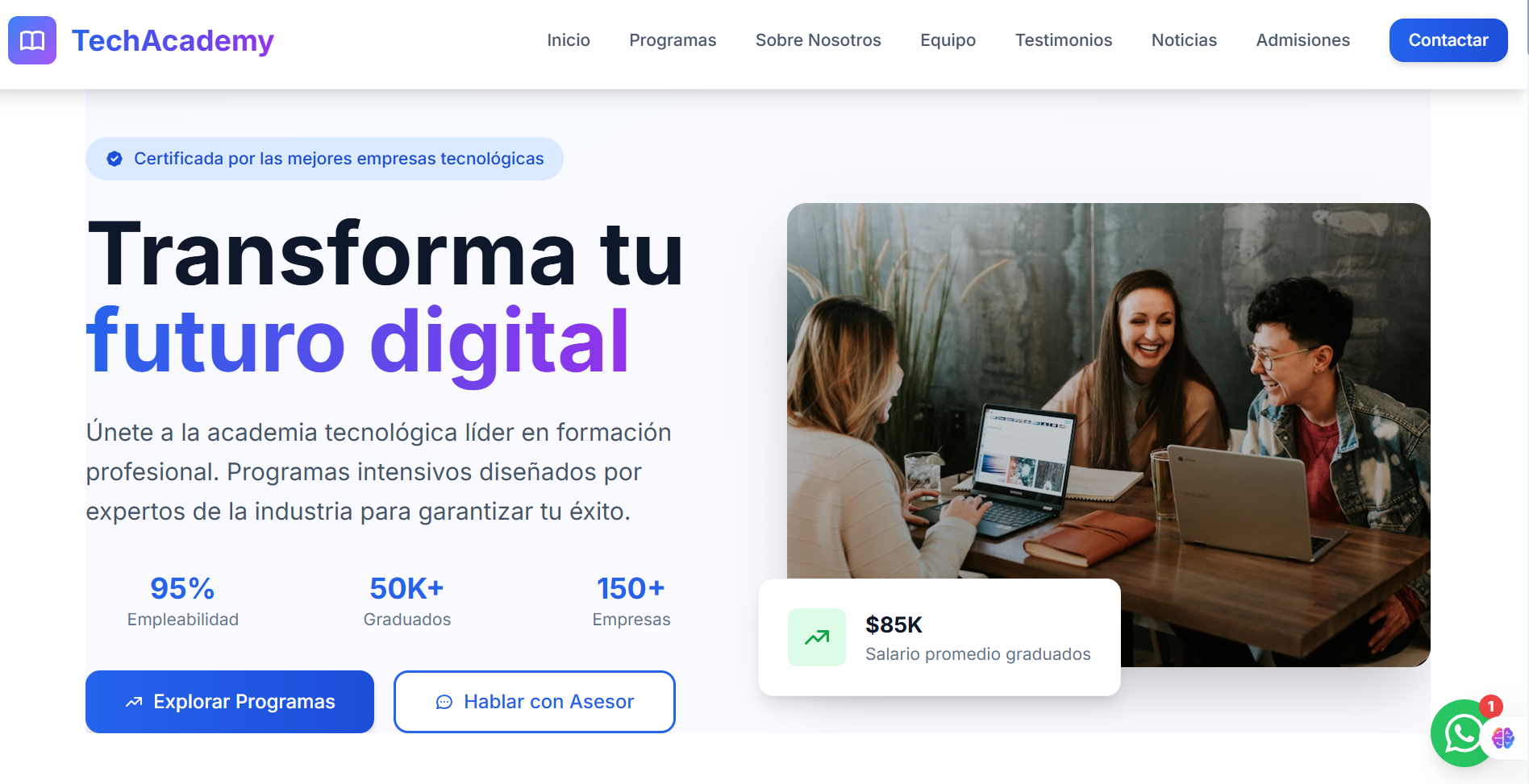 Plataforma educativa de tecnología con programas en desarrollo, data science, UX/UI y más. Diseño moderno y profesional.