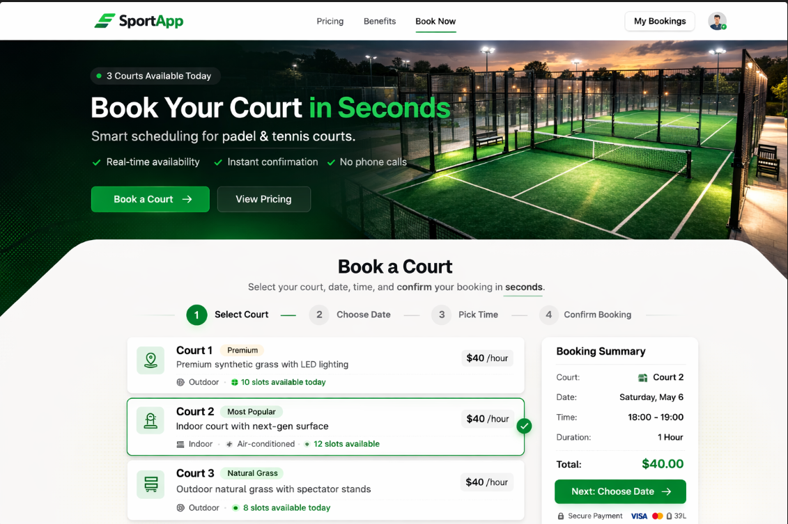 Aplicación web moderna para alquiler de canchas deportivas, con diseño atractivo y funcionalidades intuitivas.