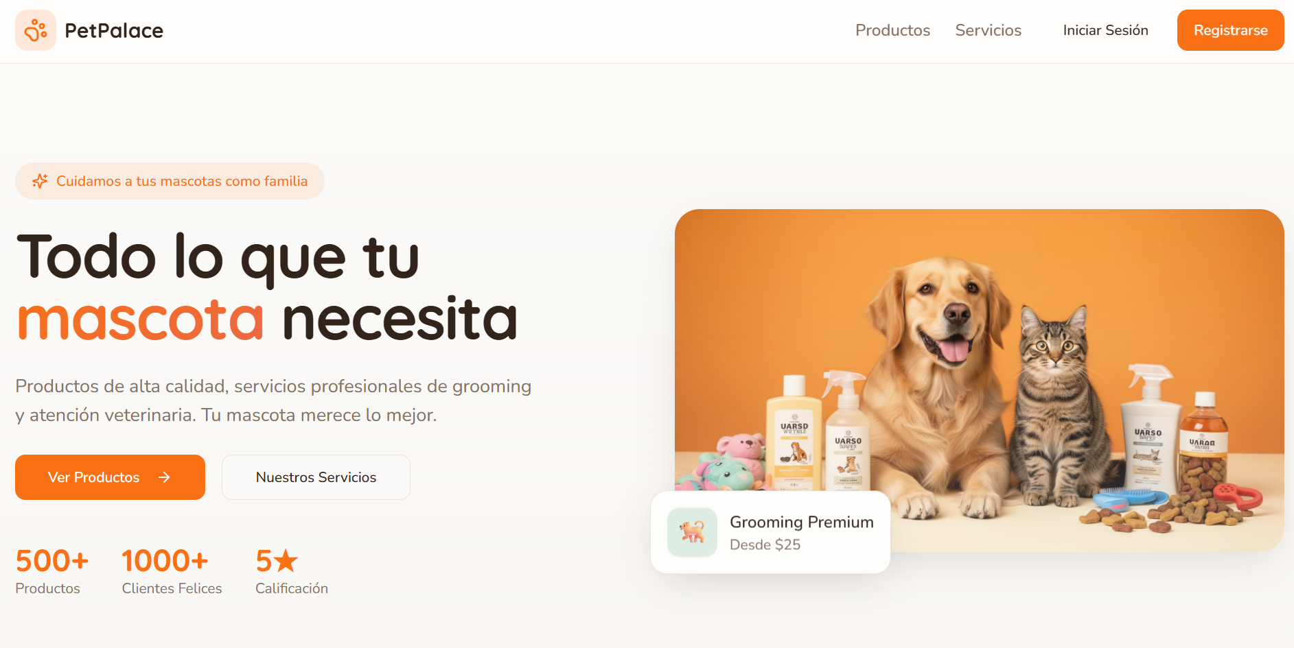 Aplicación web para amantes de mascotas con diseño moderno y funcionalidades intuitivas.